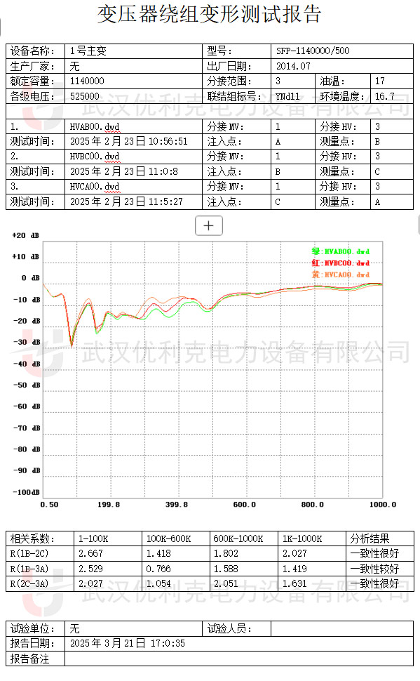相曲線應具有相似性;也可進行縱向比較,將當前測試數據與變壓器原始數據(若有)或同類型正常變壓器數據對比。通過對比曲線